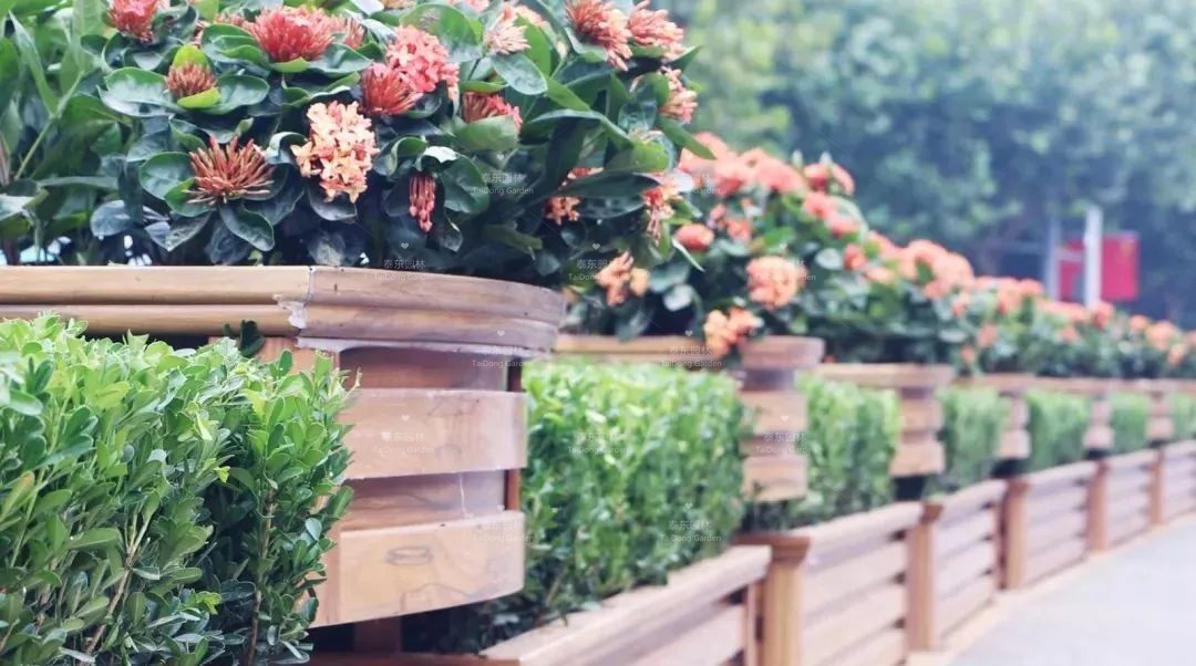 1、避免使用高彩色彩,以與天空、樹(shù)木、土石等自然色相協(xié)調(diào)的灰色系、低彩度為主。比如:紅木紋色鋁合金花箱、黃木紋色鋁合金花箱等。
